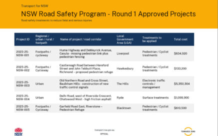 The Road Safety Program 2023/24-2025/26 was launched in early 2024. $103.6 million of funding was made available to councils across NSW. The Program seeks to improve road safety by minimising the occurrence of severe injuries and fatalities, with a focus on vulnerable road users like pedestrians and cyclists. It targets both urban areas and rural […]